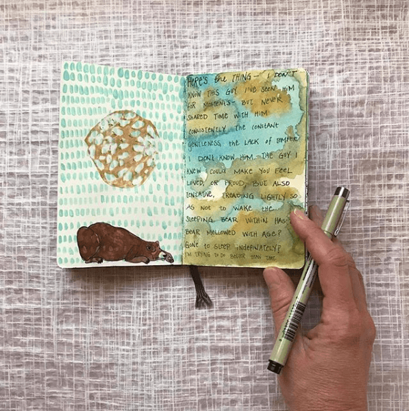 If you’re feeling drawn to emphasize the words more, you can let the text take center stage. The key is to ensure that the writing doesn’t overpower the imagery but rather works in harmony with the art. When you make writing the focal point, the design of your page should complement the flow of your words—whether it’s through the color palette, shape, or placement.