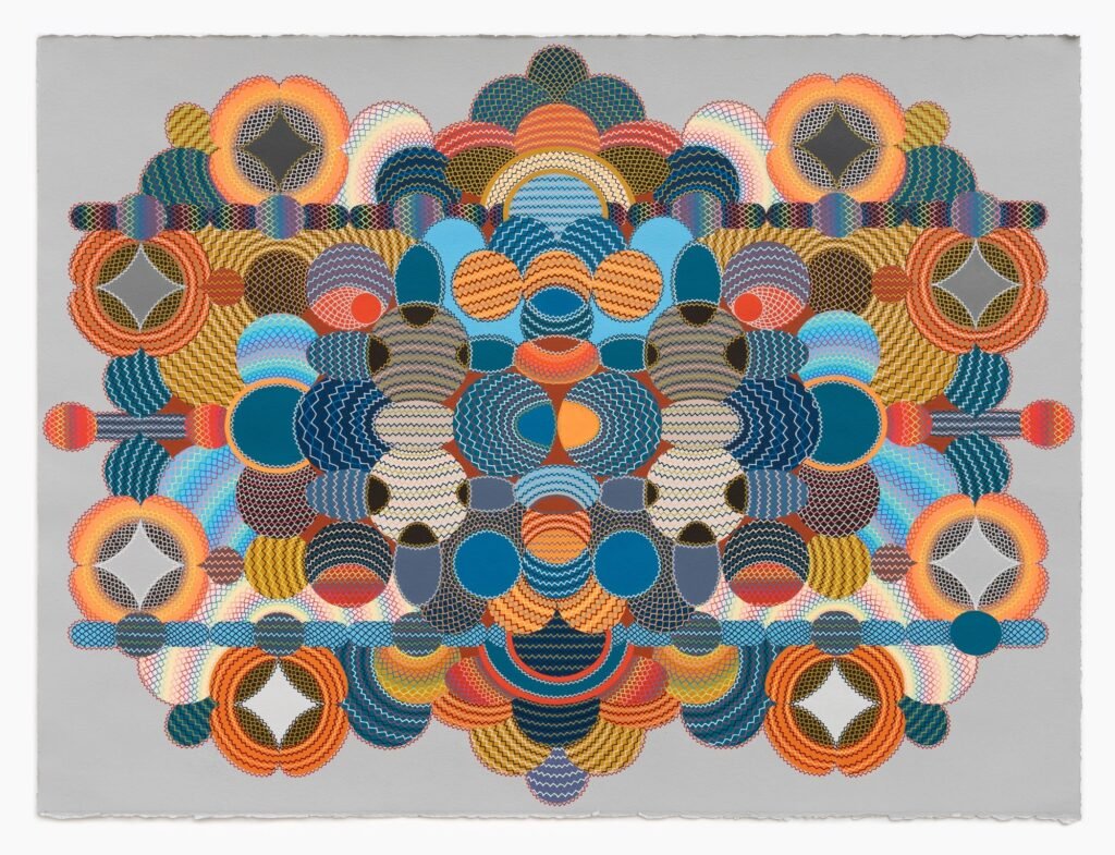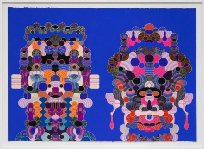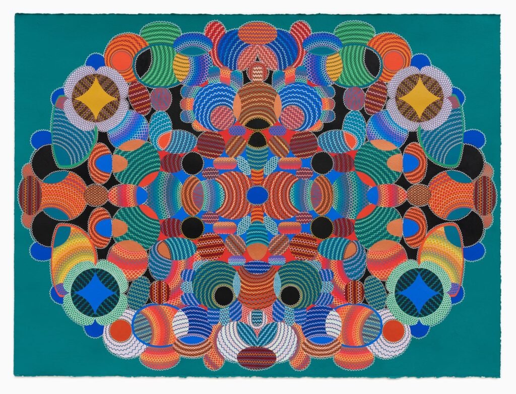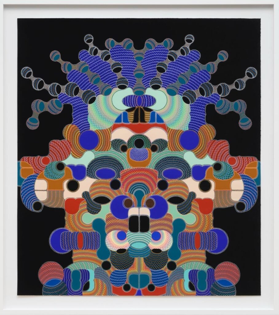 Smith’s art isn’t easily defined. At first glance, his pieces appear as a burst of color and shape—symmetrical, geometric structures that seem to dance across the paper. Vibrant spheres, interlocked in precise grids, spill outward, creating complex, energetic compositions. Yet, within these abstract patterns, Smith embeds more than mere decoration. Subtle, almost hidden faces emerge from the chaos of form, as though peering out from behind a veil of colorful geometry. Eyes, ears, noses, and mouths appear in unexpected places, their contours suggested by the surrounding shapes but never fully defined. These faces, or perhaps more accurately, these evolving forms, elude the viewer’s grasp, refusing to be pinned down to any single interpretation.
